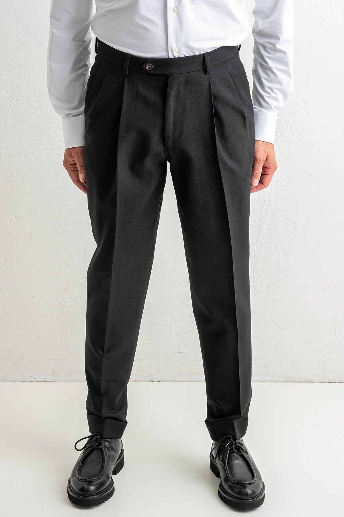 Luigi Bianchi presenterar en klassisk svart byxa i exklusiv ull som kombinerar tidlös elegans med modern funktionalitet. Materialet är lätt, följsamt och andas naturligt, vilket gör byxan lika bekväm under långa arbetsdagar som vid formella tillfällen.