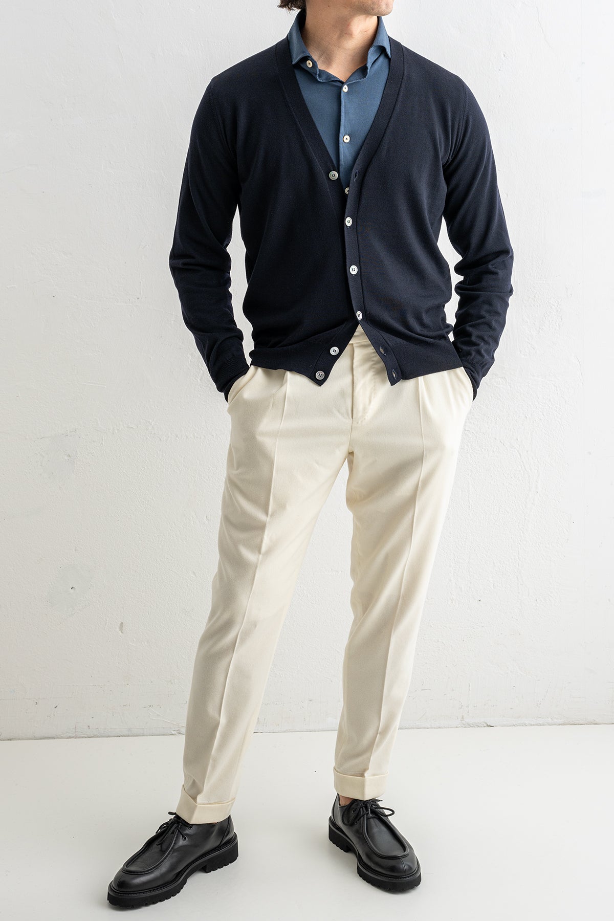 Filippo De Laurentiis presenterar en stilren cardigan i exklusiv Royal Merino ull som kombinerar lyxig känsla med tidlös design. Den djupa navyfärgen ger en elegant bas som är enkel att matcha med både ljusa och mörka plagg.