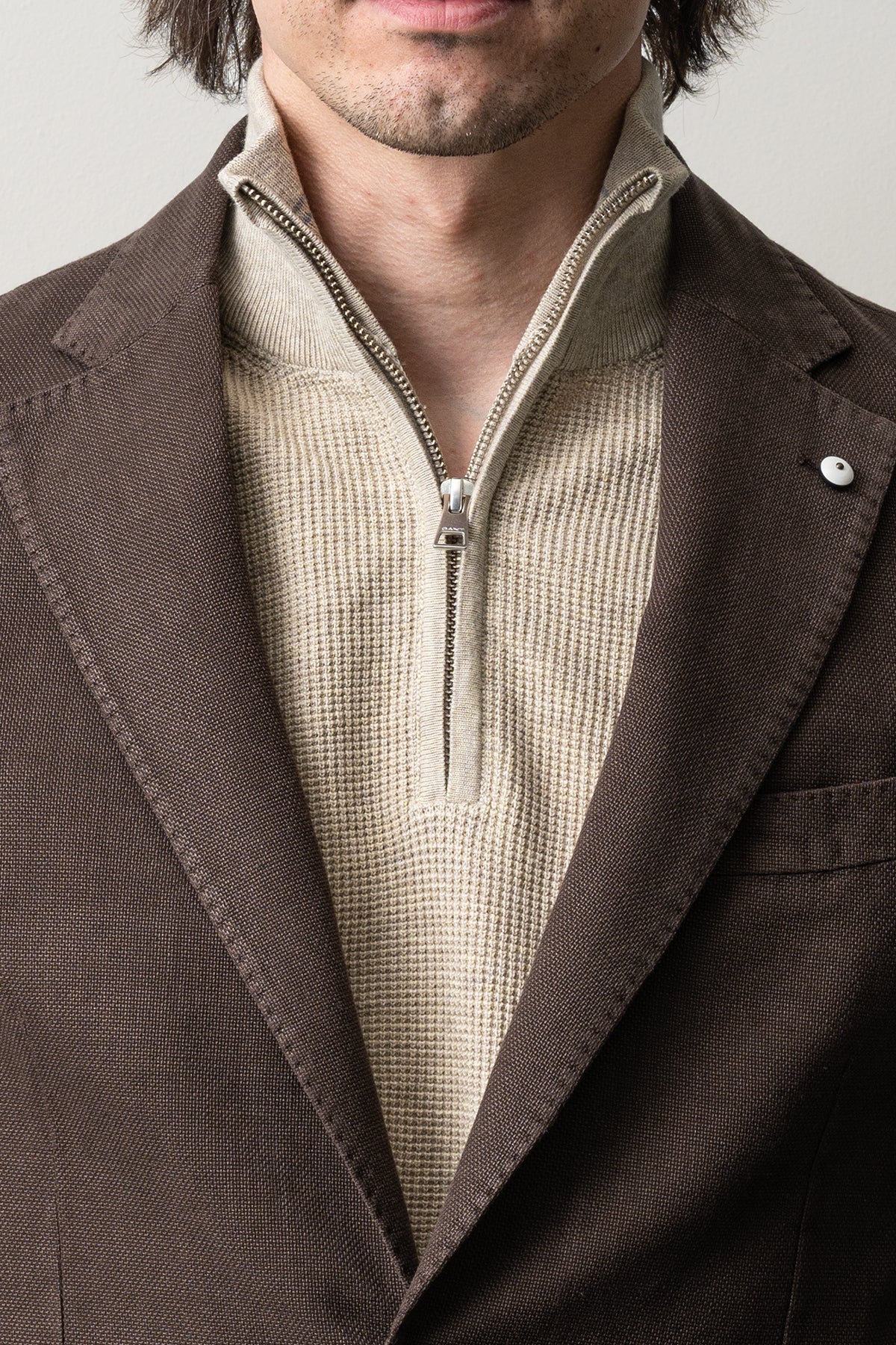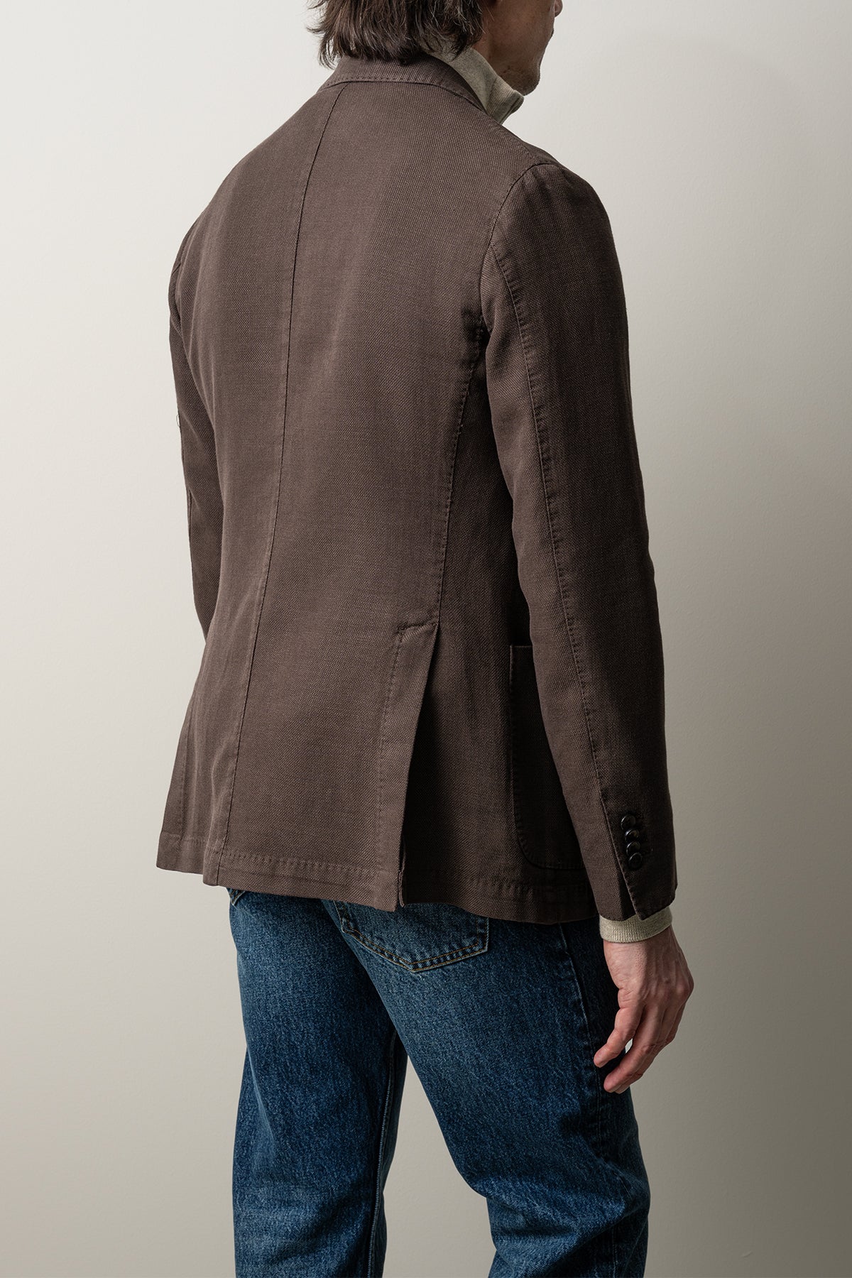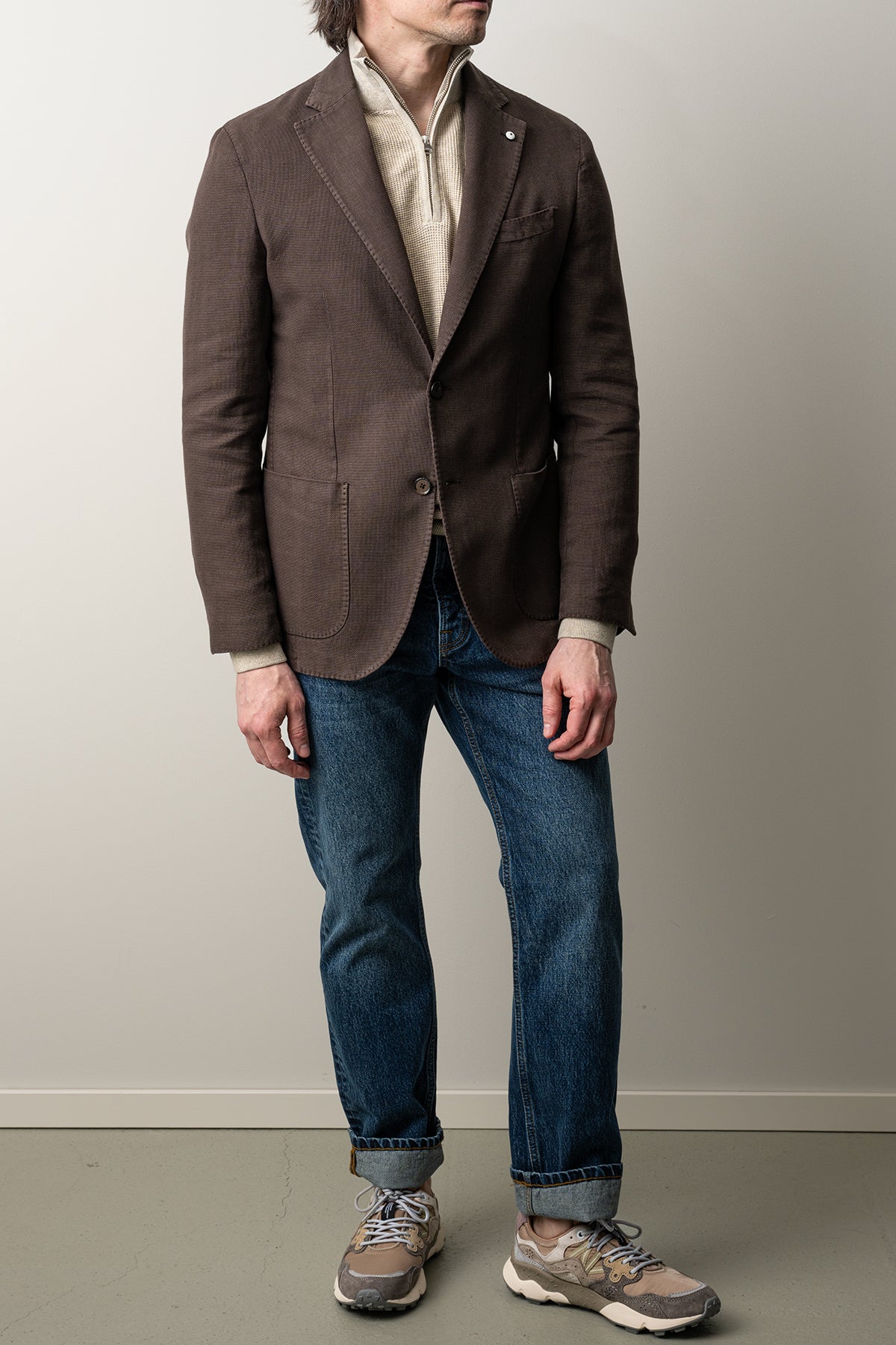 L.B.M. 1911 presenterar en stilren kavaj i en brun nyans som kombinerar italiensk elegans med modern funktion. Tillverkad i en exklusiv blandning av bomull och ramie erbjuder den en mjuk, lätt känsla med subtil lyster – perfekt för dig som söker både komfort och sofistikation.