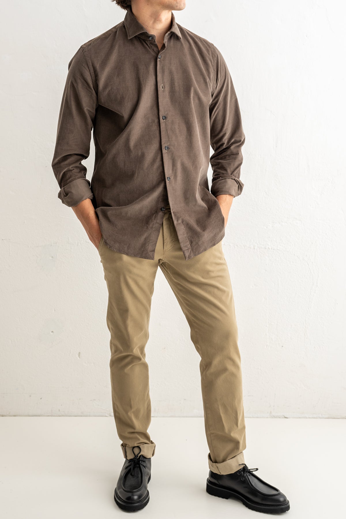 Xacus presenterar en brun skjorta i mjuk bomull som kombinerar klassisk stil med modern komfort. Den smalspåriga manchesterstrukturen ger ett elegant djup och en subtil lyster som lyfter vardagslooken.