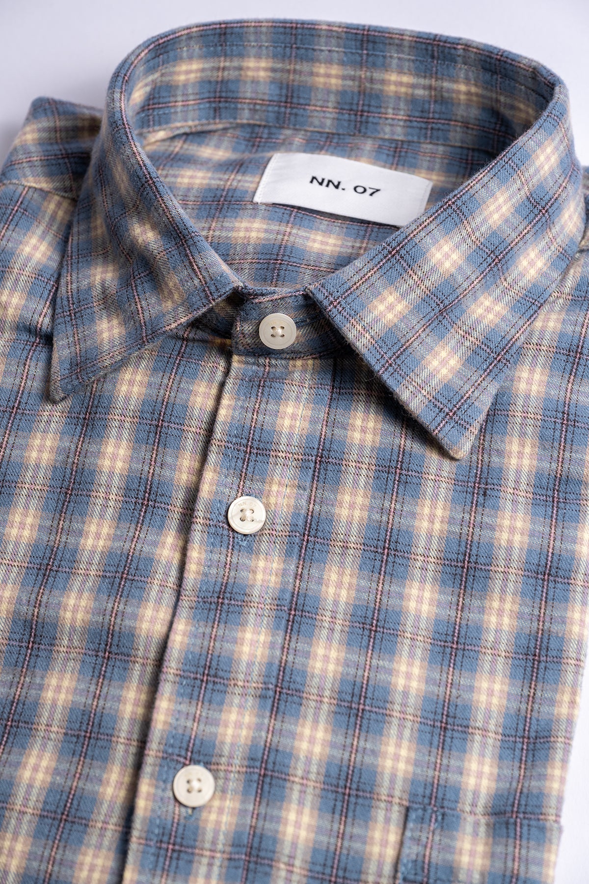 NN07 presenterar en klassisk flanellskjorta i mjuk bomull, designad i ett tidlöst rutmönster i blå toner. Materialet ger en behaglig känsla mot huden och håller formen väl, vilket gör den till ett självklart val för både vardag och mer uppklädda tillfällen.