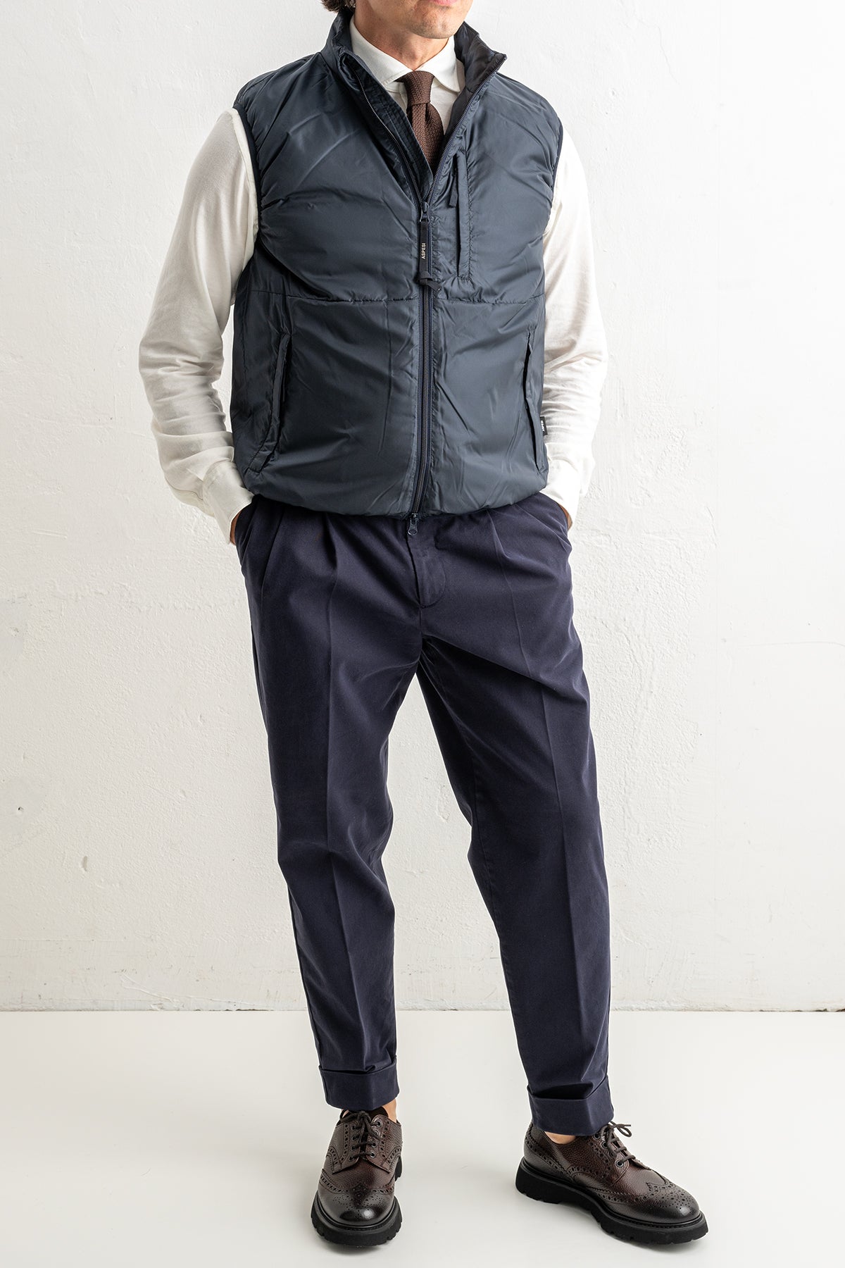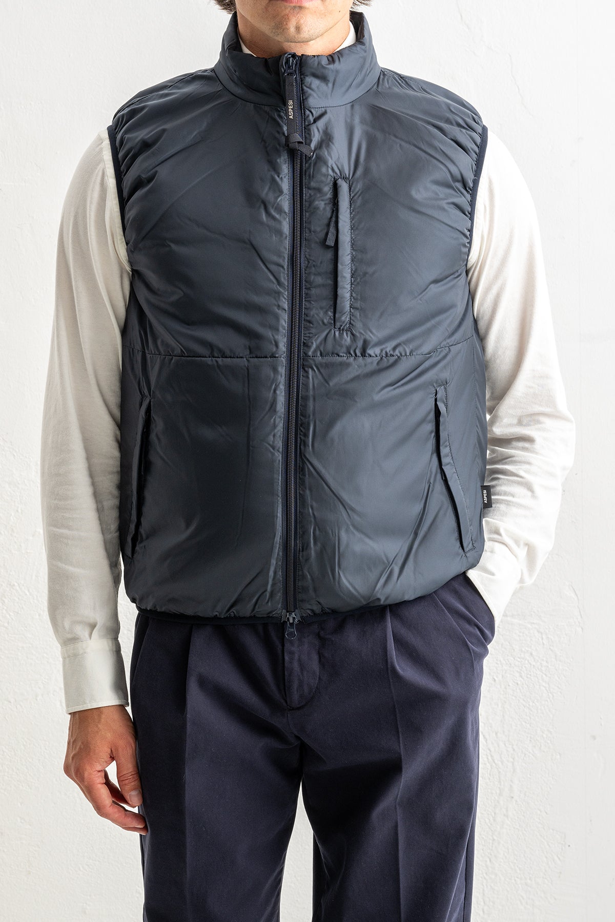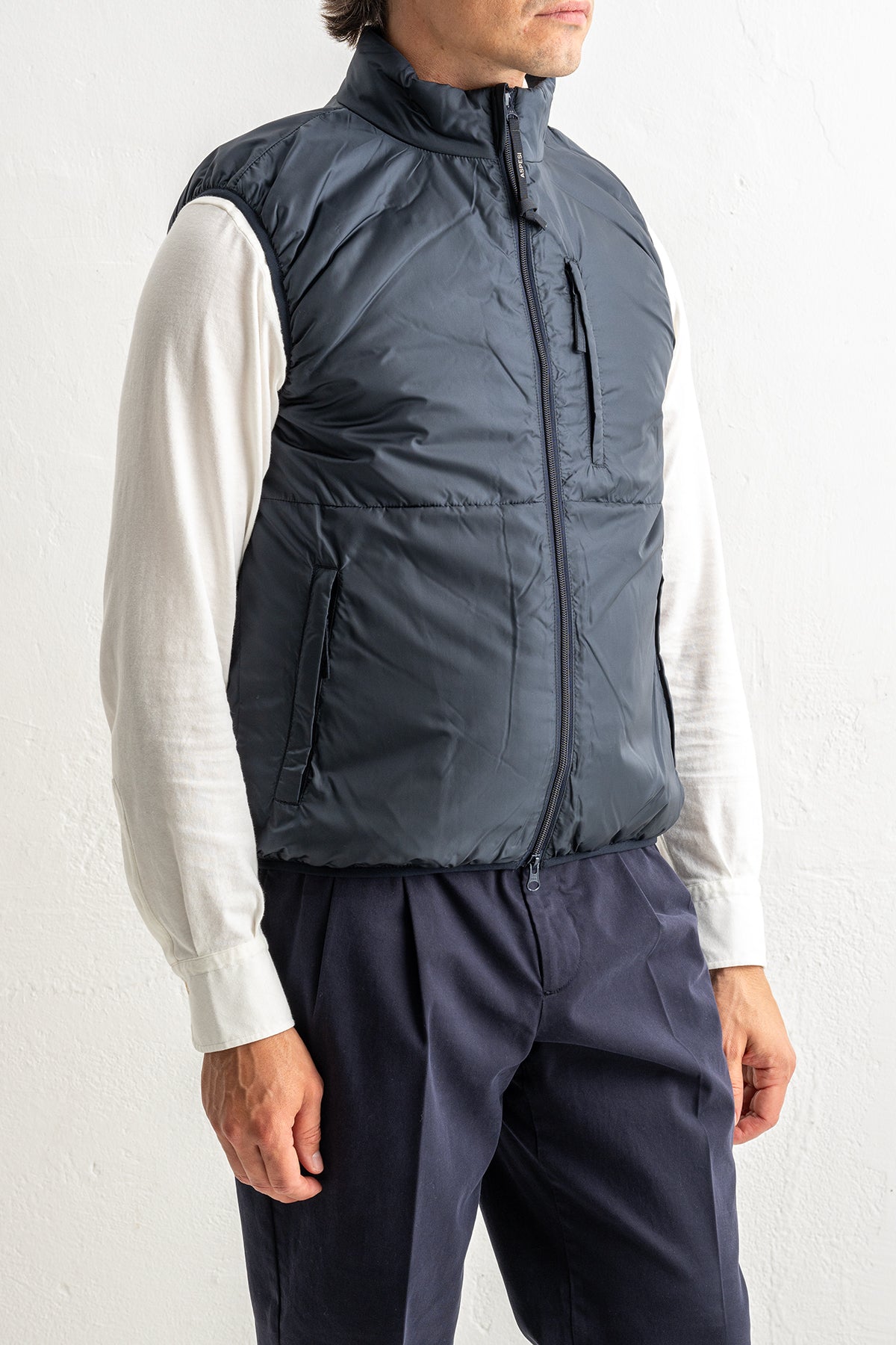 Aspesi presenterar en stilren blå dunväst som kombinerar tidlös design med hög komfort. Tillverkad i lätt och värmande dun är den perfekt för dig som söker en flexibel vardagsväst som fungerar lika bra i staden som på fritiden.