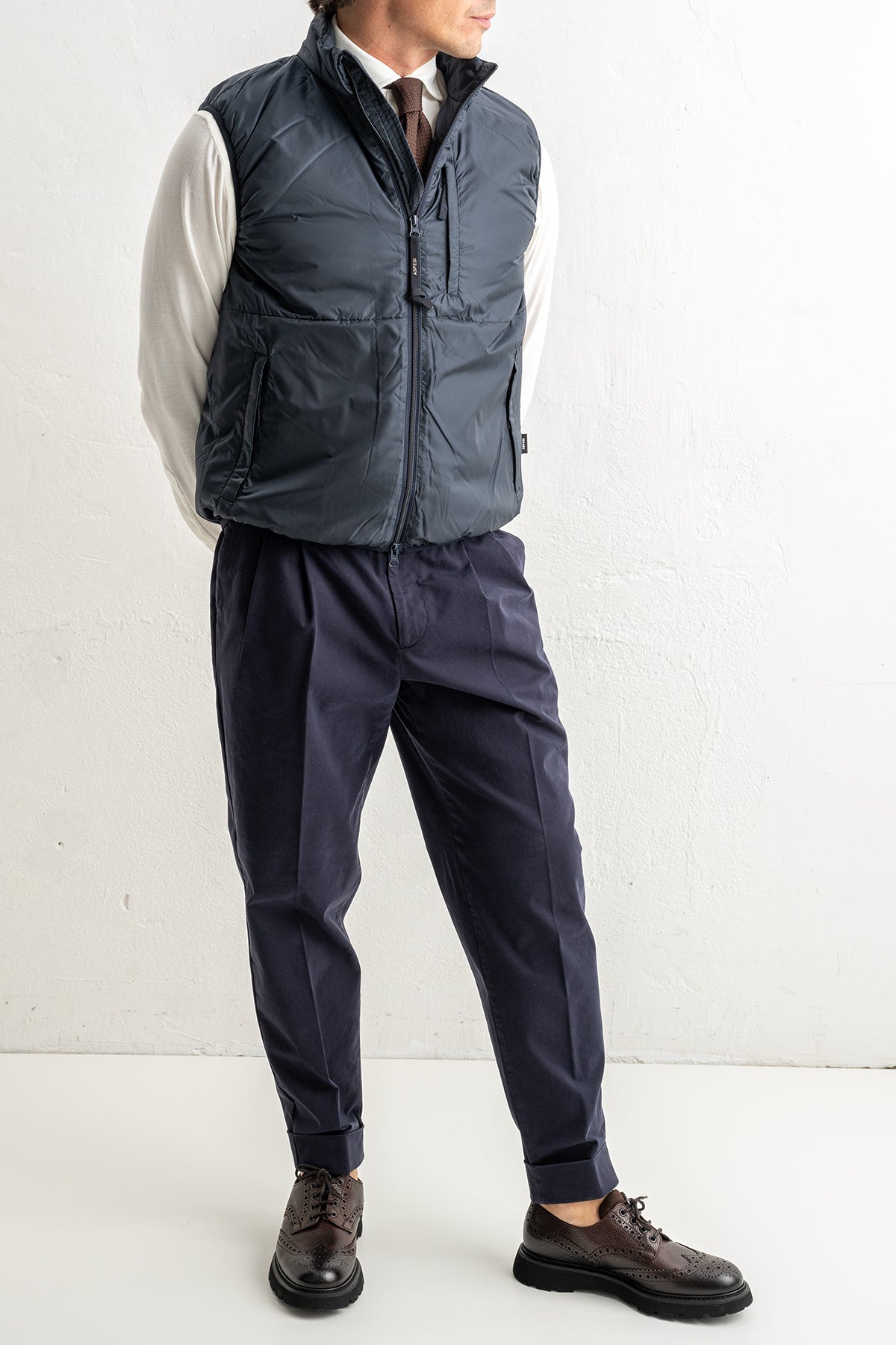Med en regular fit ger västen en balanserad passform som varken sitter för tight eller för löst, vilket gör den enkel att bära över skjorta, tröja eller stickad ull. Den höga kragen skyddar mot kyliga vindar och bidrar till ett avskalat, modernt uttryck.