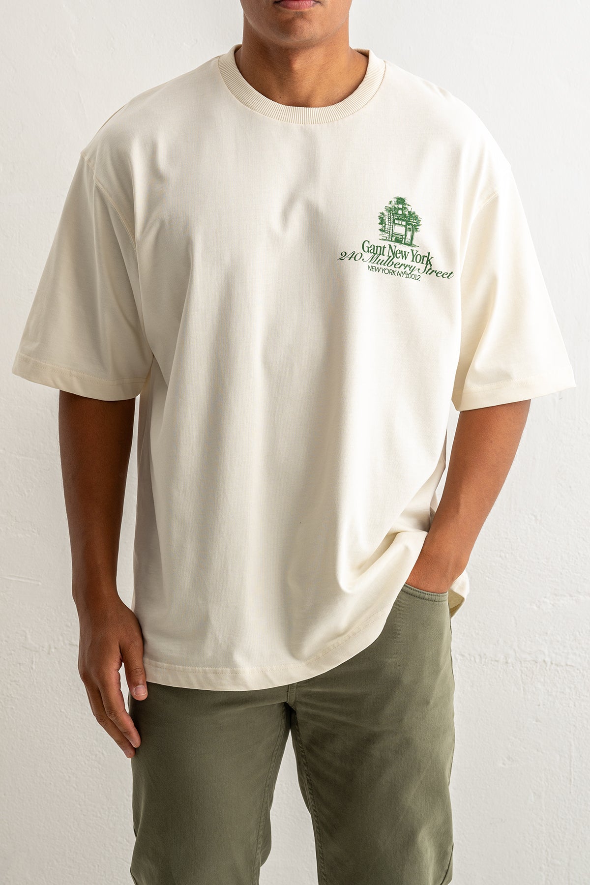 Både fram- och baksidan pryds av ett elegant tryck med Gants New York-inspirerade grafiska detaljer, vilket ger T-shirten en modern karaktär.