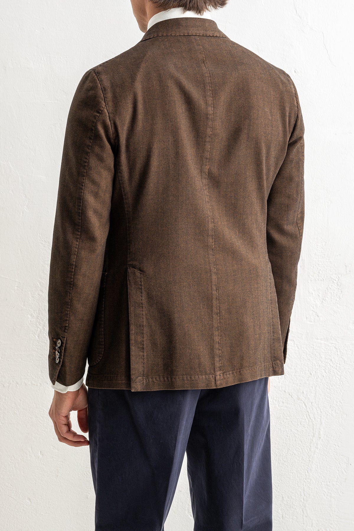Italienska L.B.M 1911 presenterar en brun kavaj i bomull som kombinerar italiensk elegans med en avslappnat sofistikerad stil. Den mönstrade ytan ger en subtil textur som förhöjer helhetsintrycket, samtidigt som den tidlösa färgen gör plagget enkelt att matcha med både skjorta och tröja.
