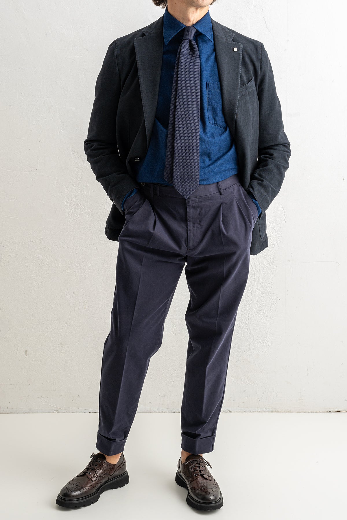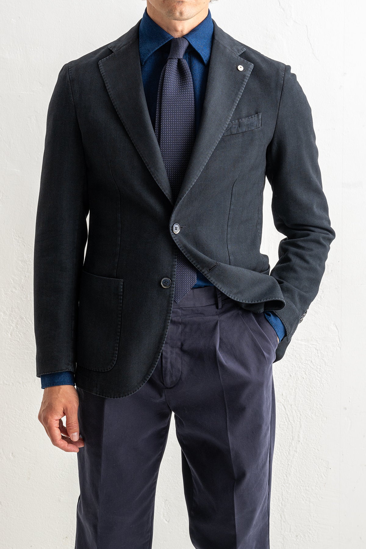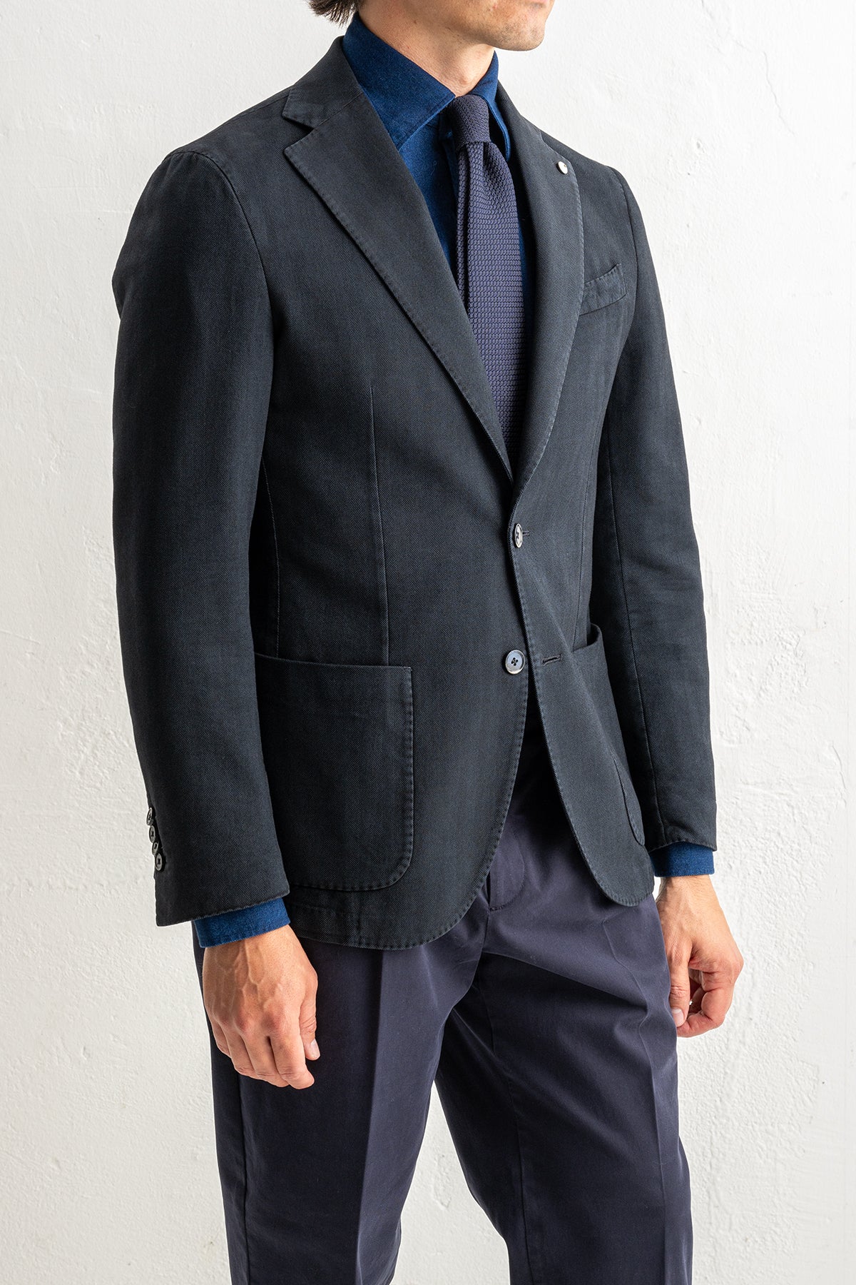 Italienska L.B.M 1911 presenterar en marinblå kavaj i bomull som kombinerar italiensk elegans med en avslappnat sofistikerad stil. Den mönstrade ytan ger en subtil textur som förhöjer helhetsintrycket, samtidigt som den tidlösa färgen gör plagget enkelt att matcha med både skjorta och tröja.