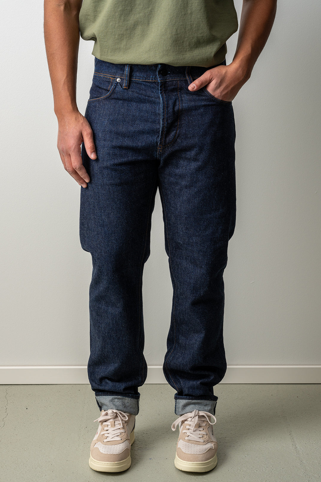 Modellen är 175 cm och väger 73 kg, han bär storlek 30.