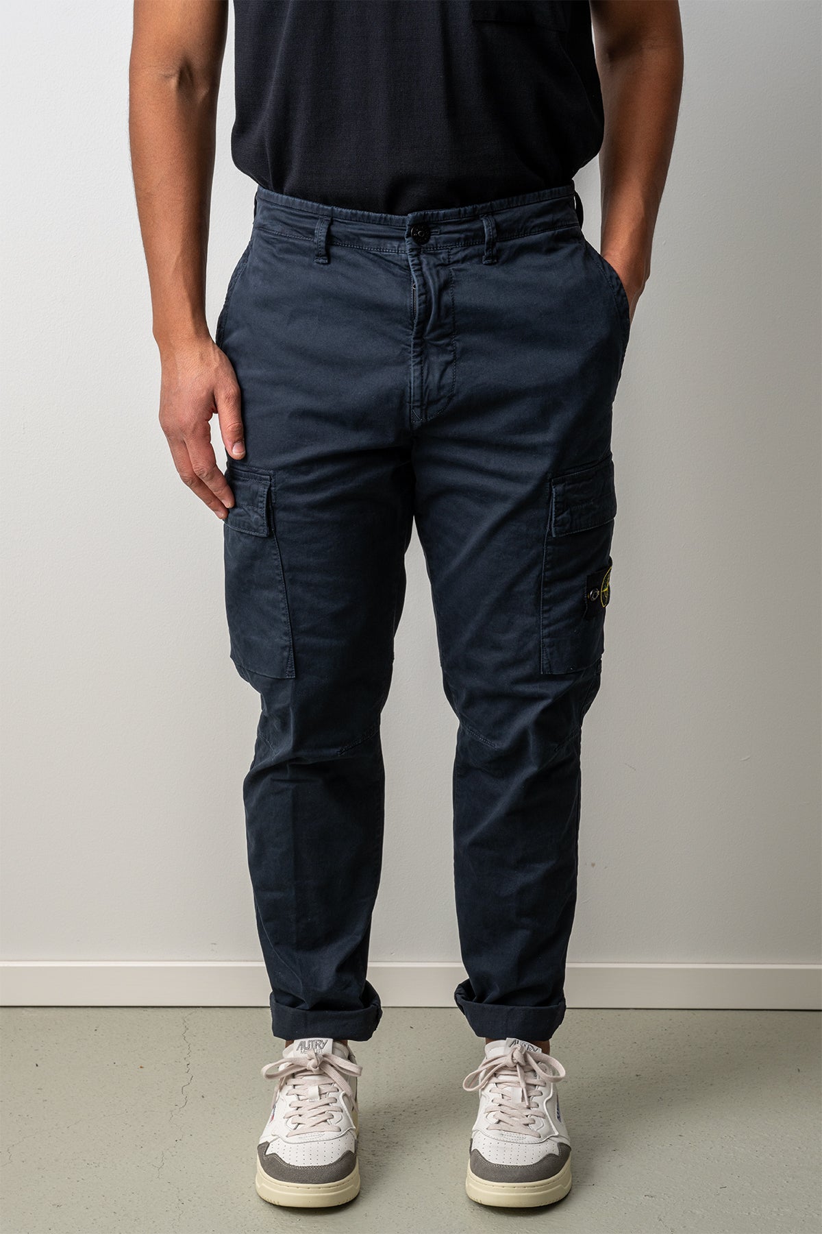 Stone Island presenterar dessa blå cargo byxor i bomull, designade för en stilren och funktionell vardag. Det slitstarka materialet ger hög komfort och lång hållbarhet, samtidigt som tyget andas väl för behaglig användning hela dagen.