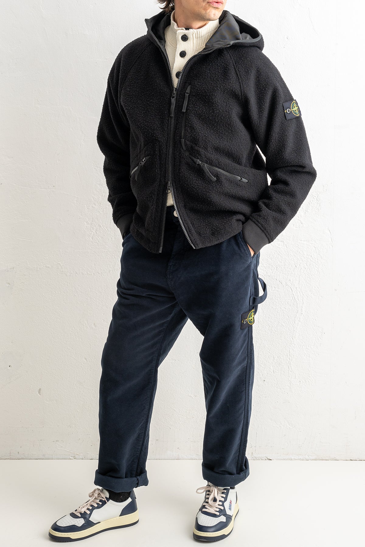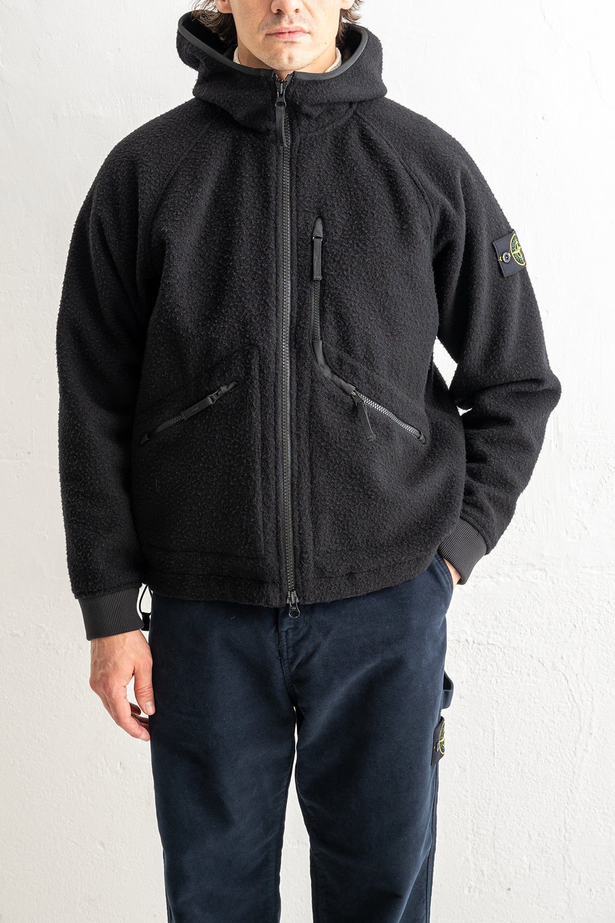 Stone Island presenterar en exklusiv fleecejacka i ull som kombinerar värme, funktion och tidlös design. Den svarta färgen ger ett stilrent uttryck som enkelt matchas med både vardags- och fritidsplagg.