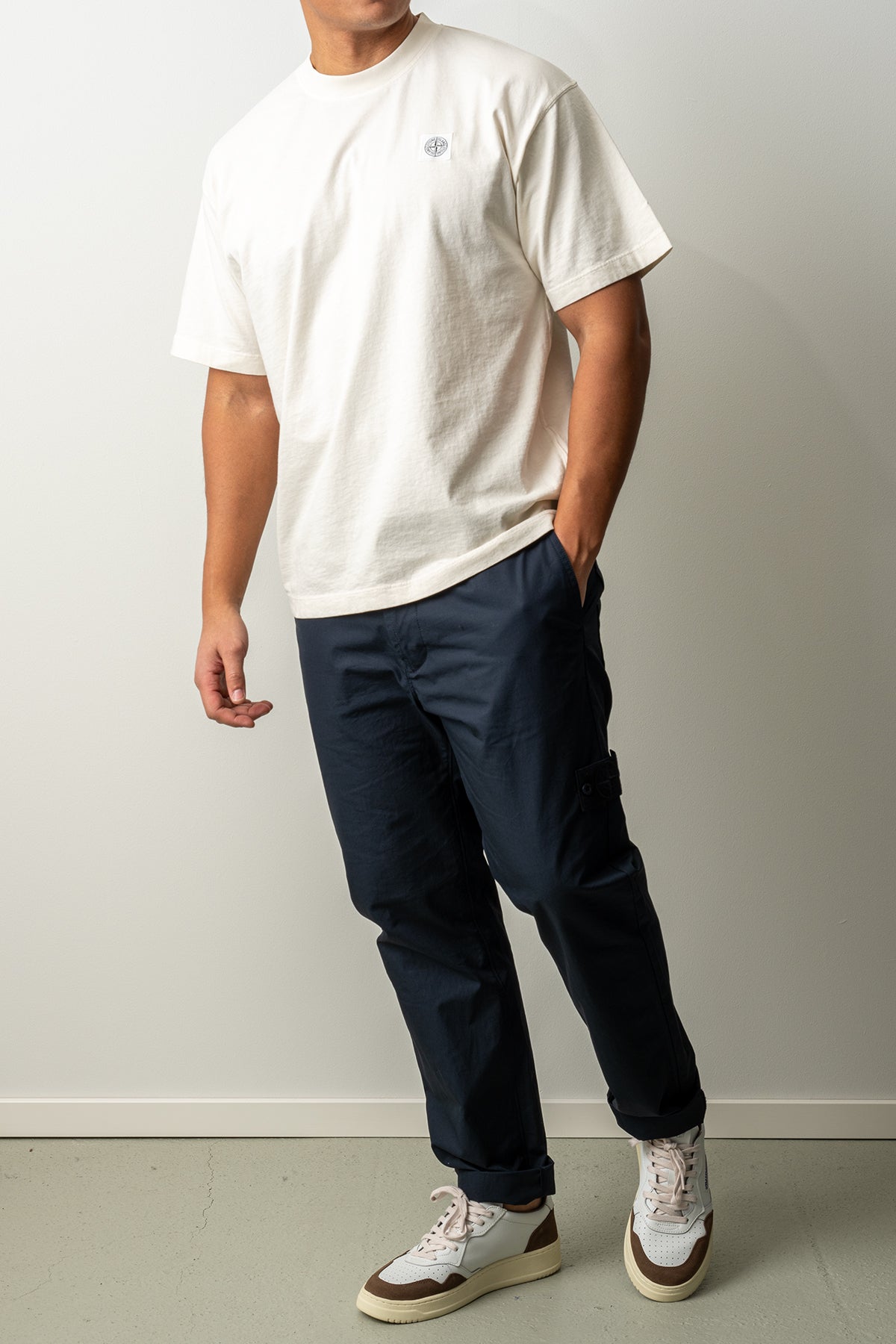 Diskret batch på bröstet sätter en tydlig Stone Island-signatur och gör T-shirten lätt att matcha med jeans eller chinos för en modern fritidslook.
