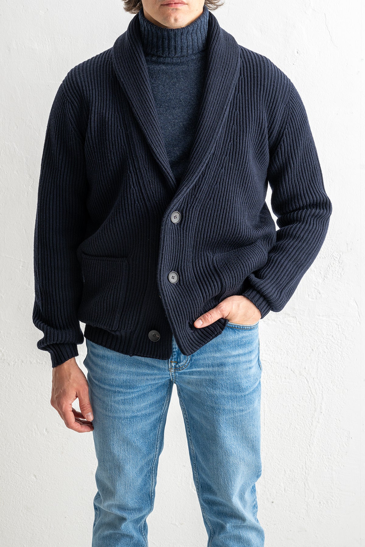 Med en regular passform och ribbstickad struktur sitter tröjan bekvämt och följsamt över kroppen. Den klassiska sjalkragen och de diskreta fickorna framhäver ett elegant och avslappnat uttryck.
